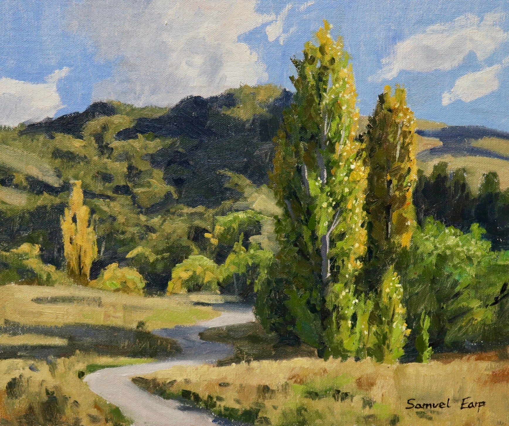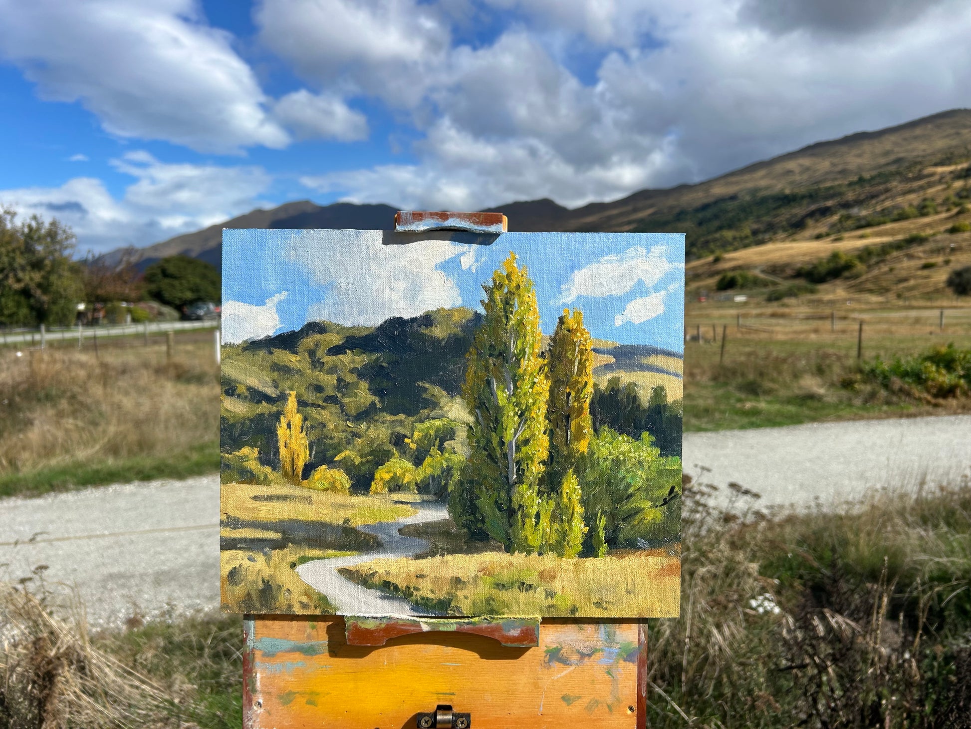 Standing beneath the dramatic foothills of Queenstown's mountains, I found myself captivated by these majestic Lombardy poplars as they marked the gentle transition from summer's end to autumn's golden embrace. This 10" x 12" plein air oil painting captures a fleeting moment I witnessed and painted entirely outdoors in the pure light of a beautiful autumn day.