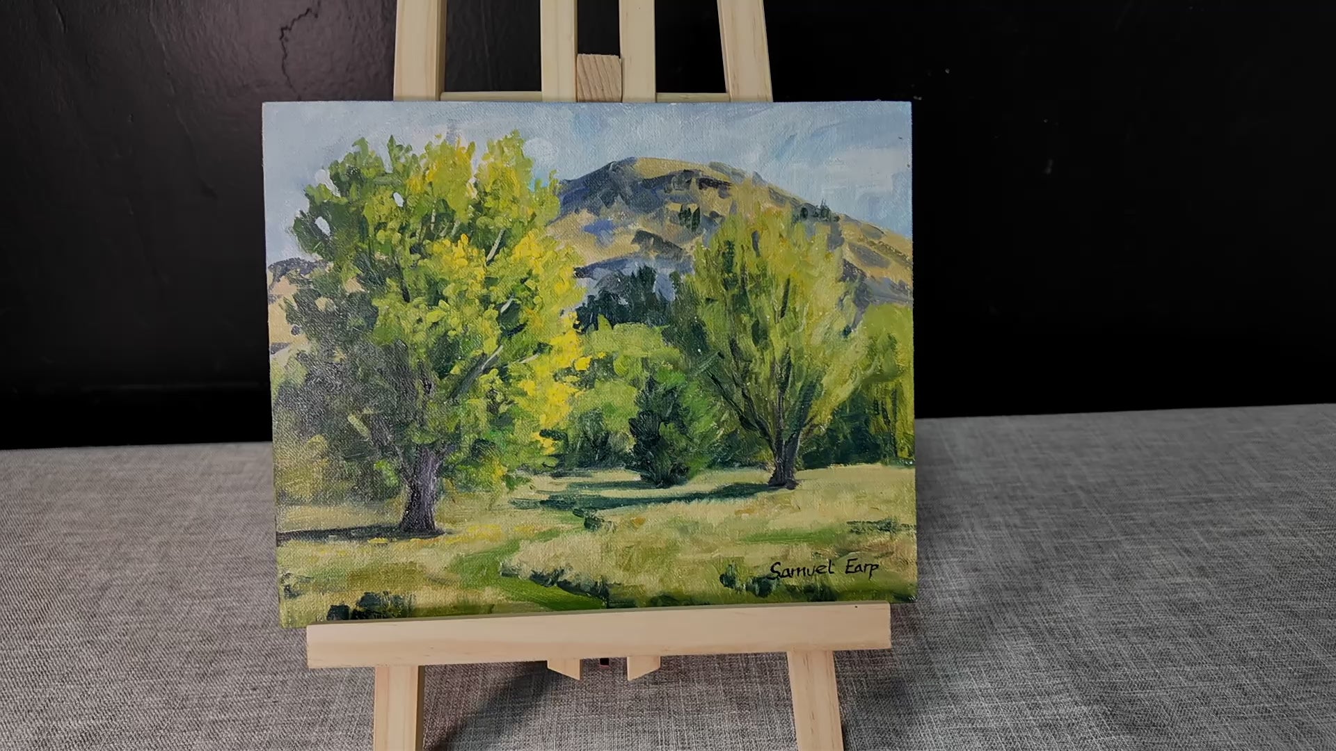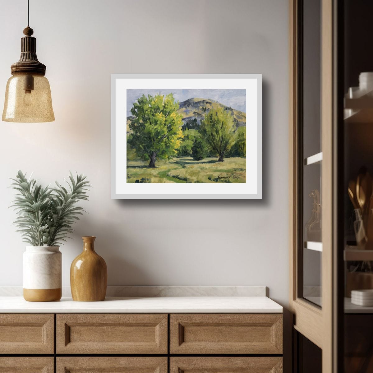 My brushwork captured both the grandeur of these sentinel trees and the intimate details of the meadow floor, where light and shadow played across the gentle slopes leading to the distant mountain. The overcast conditions allowed me to focus on the subtle color harmonies and atmospheric depth that make this scene so deeply peaceful and contemplative.