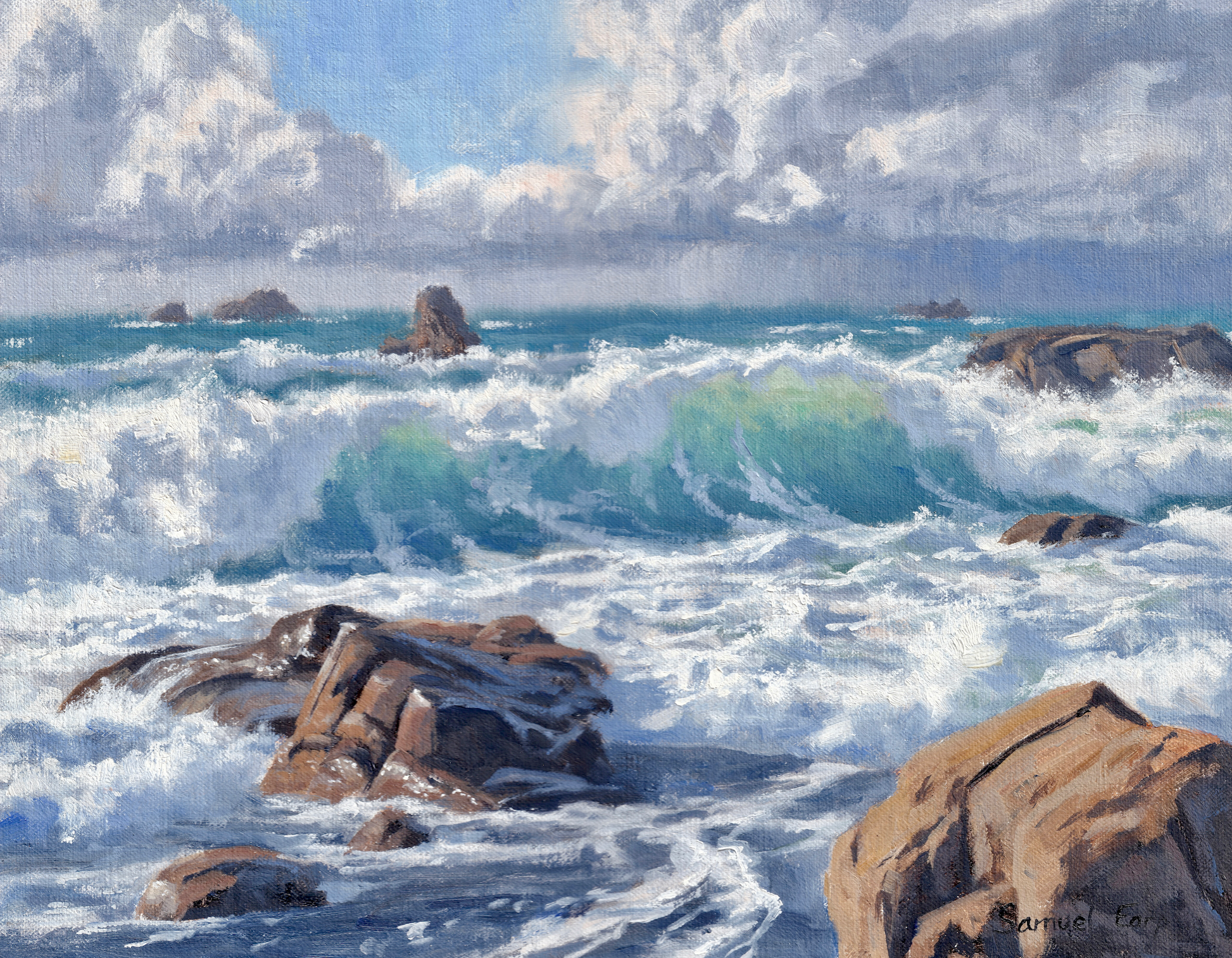 - Rich, textured brushwork capturing the sea's movement