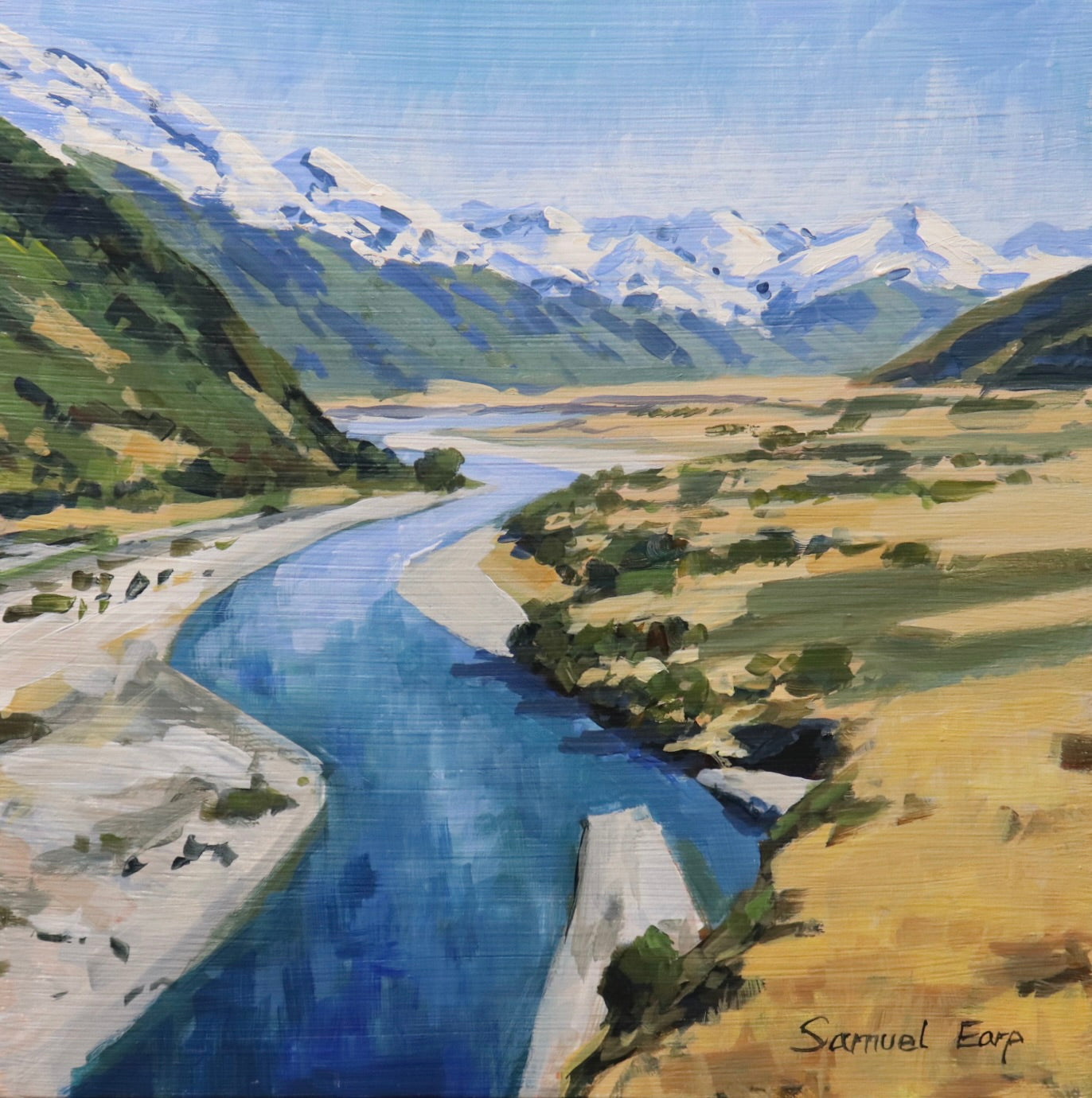 Experience the tranquil beauty of New Zealand’s Rees Valley with this original landscape painting by Samuel Earp. Created en plein air and completed in the studio, this one-of-a-kind artwork captures the serene flow of a river winding through lush greenery, framed by rolling hills and majestic, snow-capped mountains.