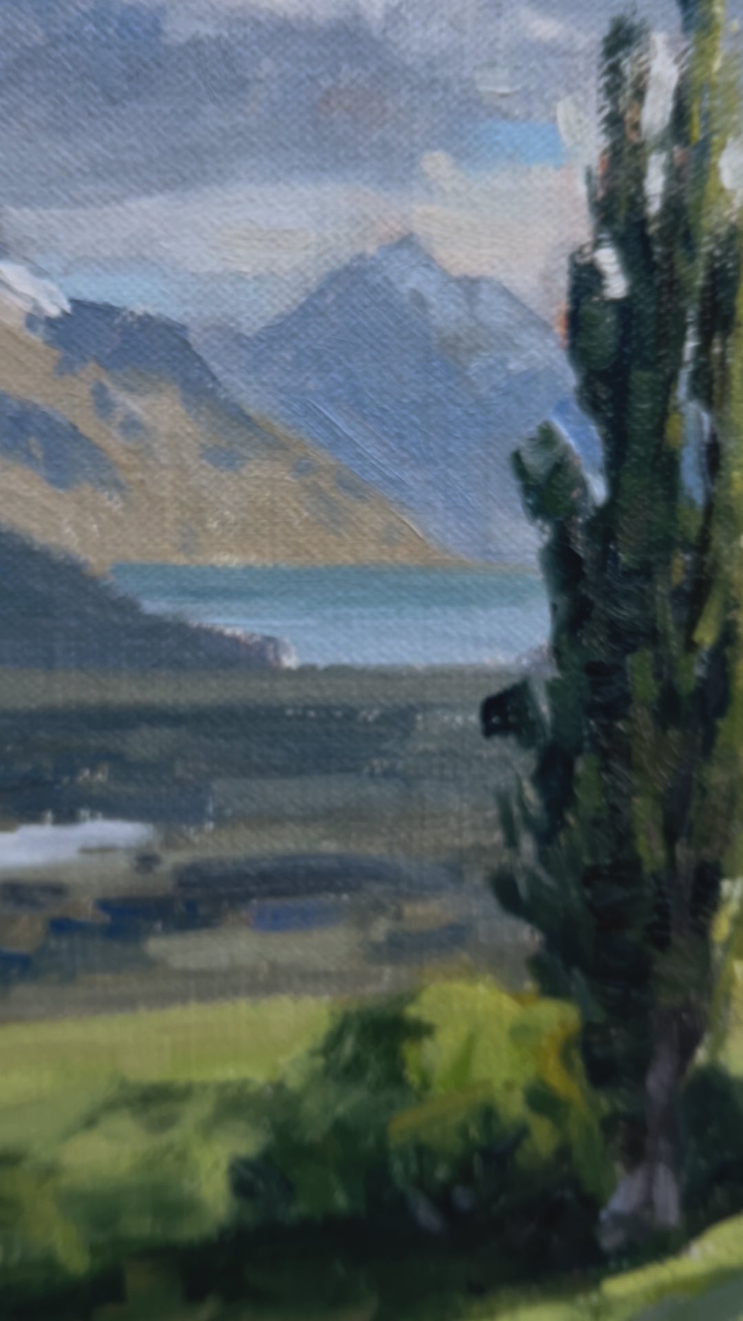 In the fleeting moments between a day of very wet weather and darkness, I captured this dramatic vista of Lake Wakatipu and Queenstown's distant lights, framed by the iconic silhouettes of Lombardy poplars against snow-dusted mountain peaks. This 8" x 10" plein air oil painting on linen panel tells the story of determination, weather, and the raw beauty of New Zealand's Southern Alps.